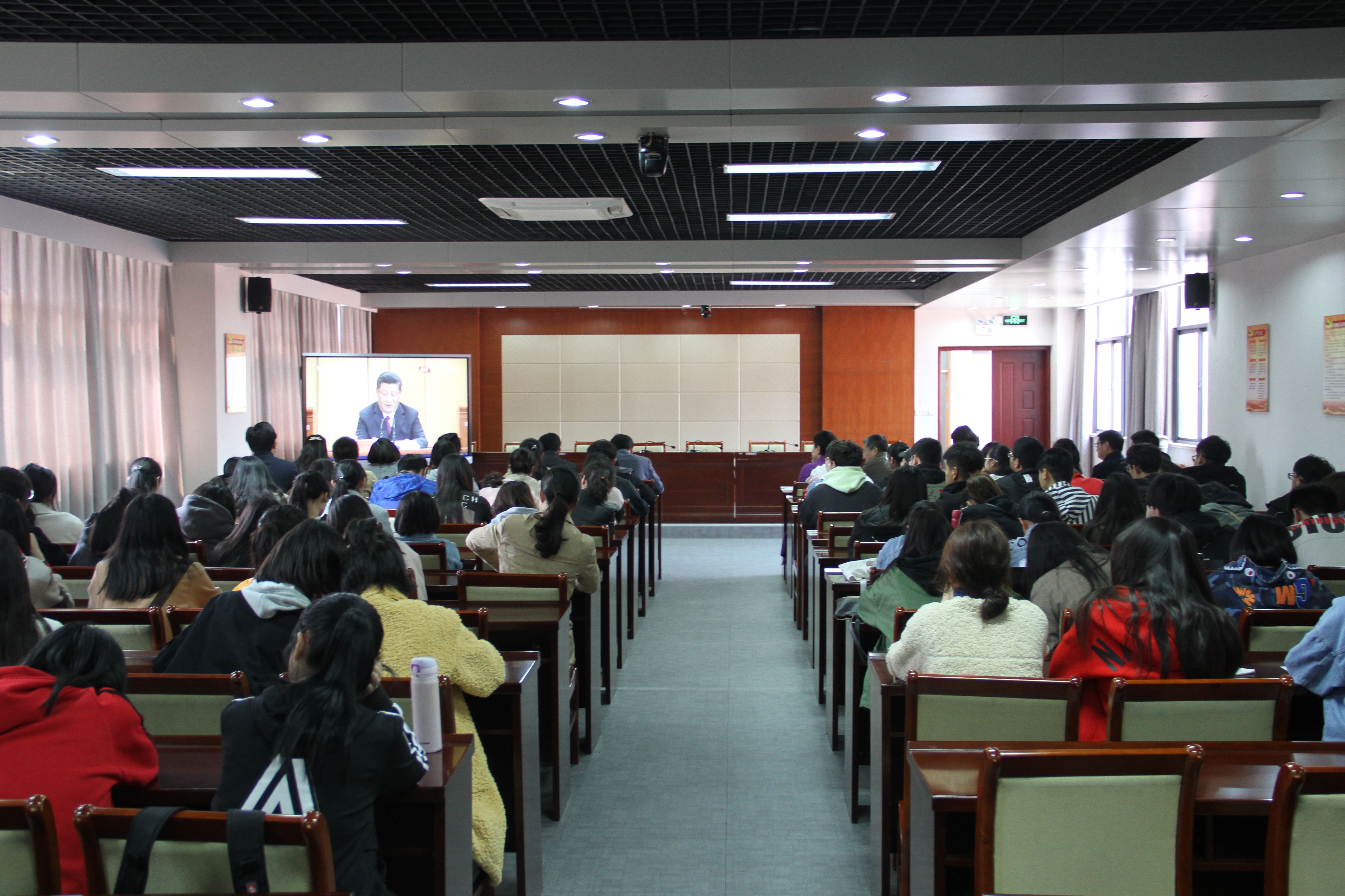 学校领导班子全体成员,各团总支书记,马克思主义学院教师,校团委全体成员,青年学生代表在学海路校区五楼大会室集体收看了电视转播。学校广大青年学生在团组织的号召和组织下,通过电视、网络、手机客户端等媒体平台集中或分散观看了大会直播。
