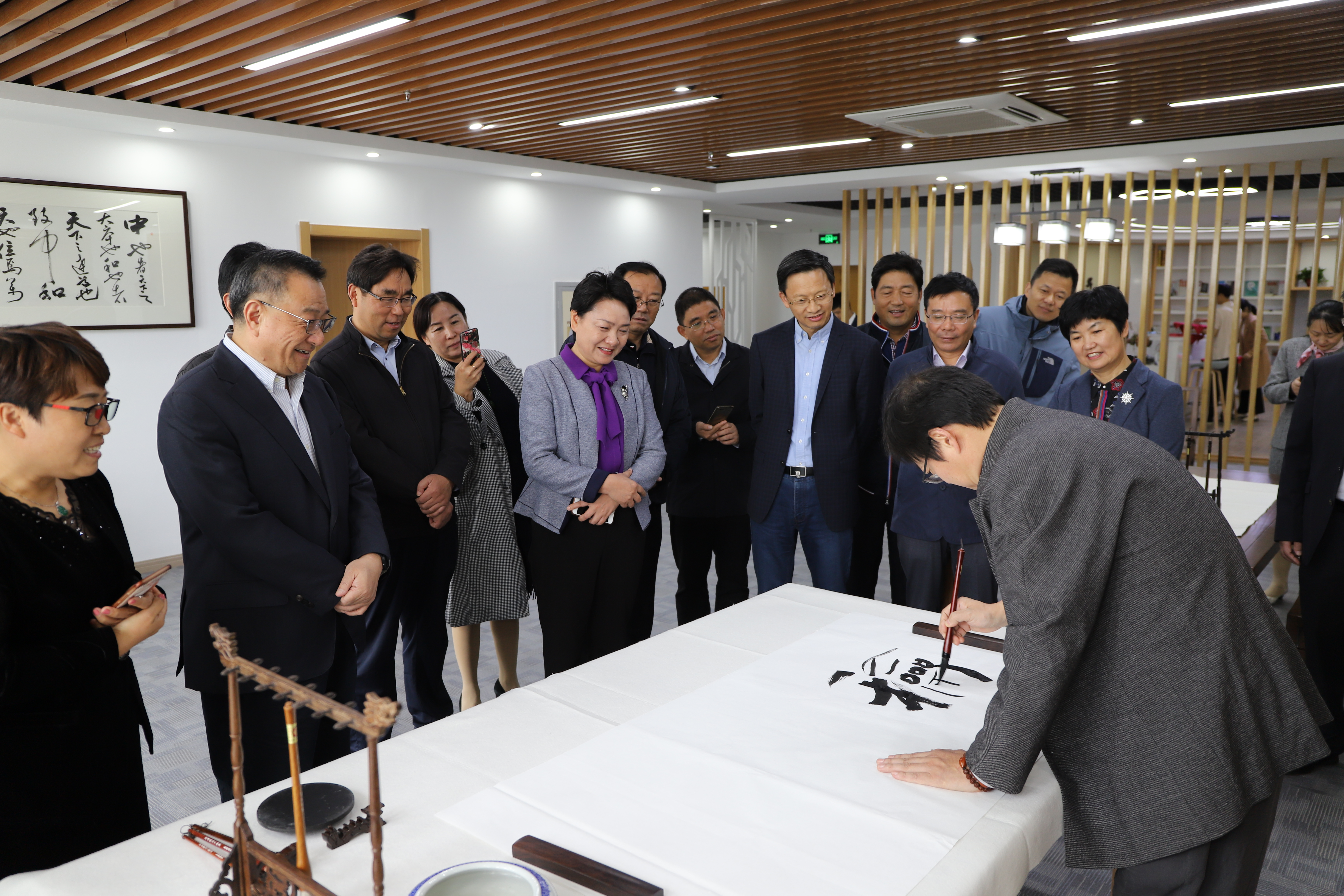 李驰一行首先来到盐城幼儿师范高等专科学校,在“铁军艺苑”前,详细了解鲁艺华中分院的红色历史,革命先烈和前辈不忘初心、浴血奋斗的牺牲精神给大家留下了深刻印象。随后,李驰主席、姜友新副主席一行来到设在我校的省政协“委员之家”,为“江苏省政协委员活动之家”、“鹤鸣书苑”揭牌。