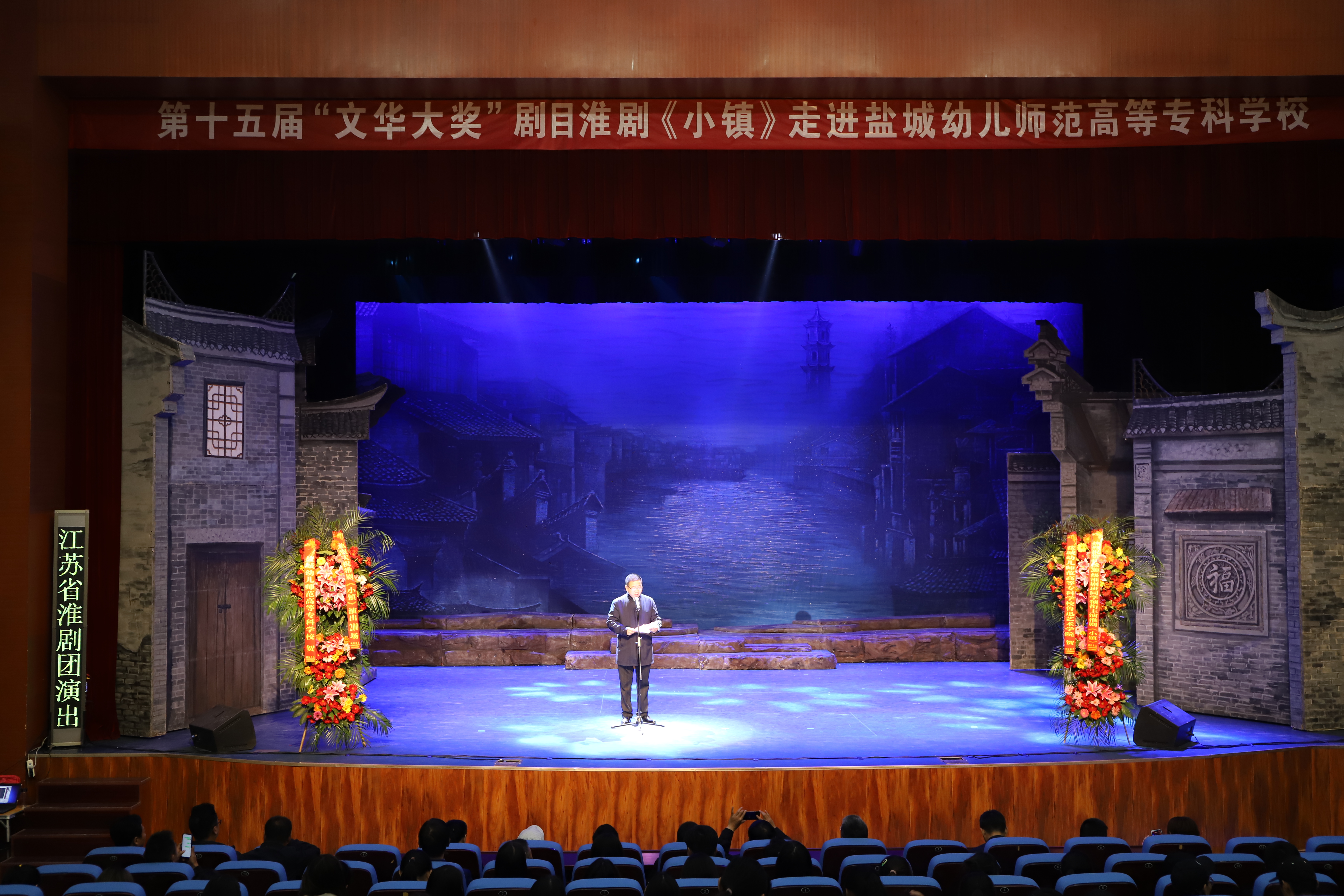 在29日晚上的演出前,校党委委员戴永湖致辞,他代表全体师生员工,对淮剧《小镇》巡回演出至200场表示热烈祝贺。他指出,《小镇》在社会上赢得广泛赞誉,展现了国家级非遗淮剧艺术的无限魅力。他希望全体师生以此次活动为契机,进一步加深对戏曲高雅艺术的理解和热爱,深入汲取中华优秀文化的艺术精髓,提高思想修养、提升精神境界,为弘扬和传播先进文化,创建文明校园、构筑和谐社会发挥应有的作用。