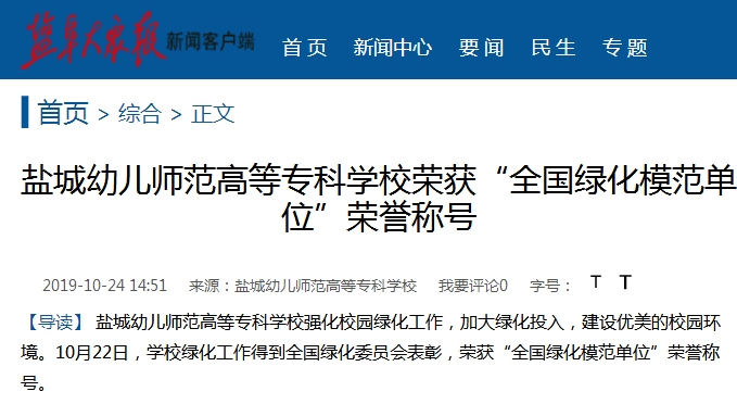 盐阜大众报:盐城幼儿师范高等专科学校荣获“全国绿化模范单位”荣誉称号