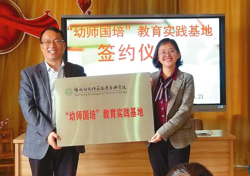 日前,“幼师国培”教育实践基地签约揭牌仪式在潘黄中心幼儿园举行,盐城幼儿高等师范专科学校和潘黄中心幼儿园负责人现场签订协议书,并为基地揭牌。