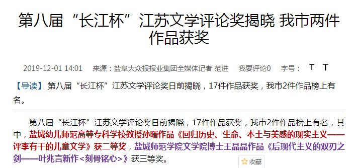盐阜大众报:我校孙曙教授荣获第八届“长江杯”江苏文学评论奖二等奖