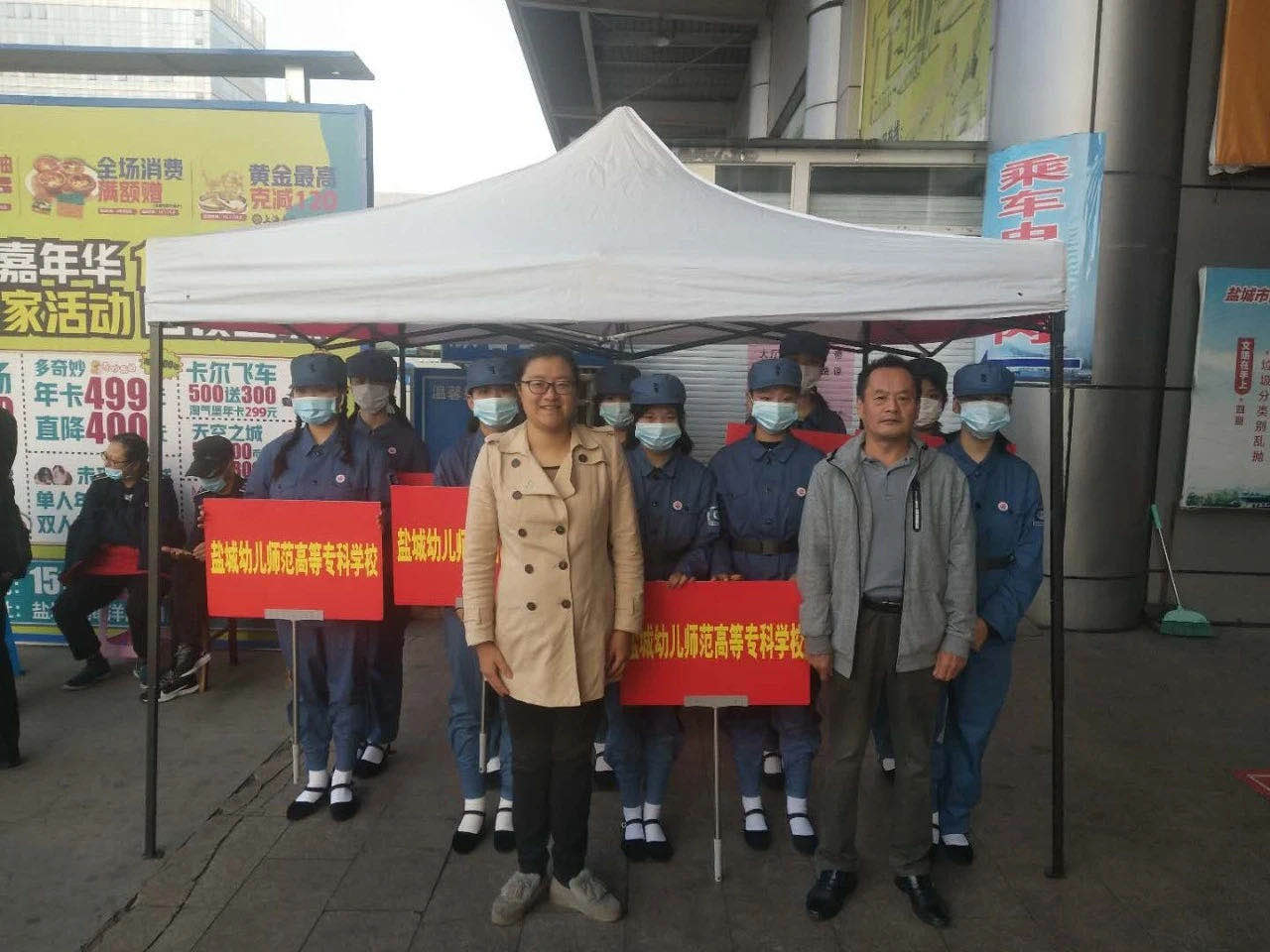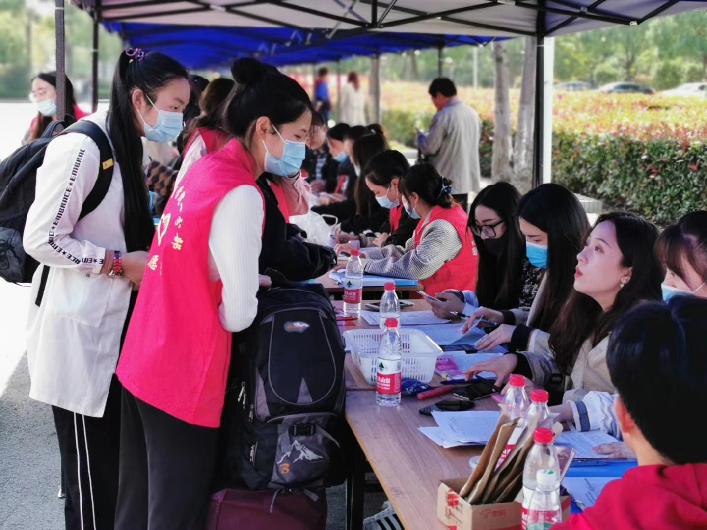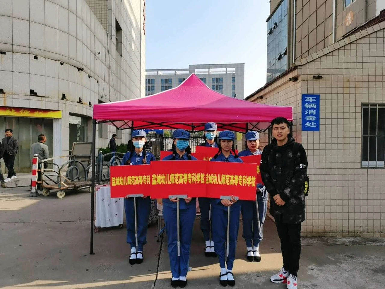 为方便新生报到,学校在高铁站、飞机场、盐城客运站、盐都车站、白马车站设立了新生接待处,学生及家长上车前进行体温测量,测量合格后上车驱往学校。