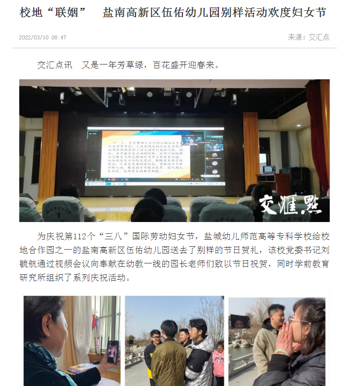 在盐城幼儿师范高等专科学校的指导下,伍佑幼儿园今年的“三八”节系列活动别样而独特,不仅传递了节日的祝福、放松身心、感受生活,也丰富了思想内涵、陶冶了情操,更引导老师们凝心聚力、团结友爱、潜心幼教,以便今后更好地享受工作。