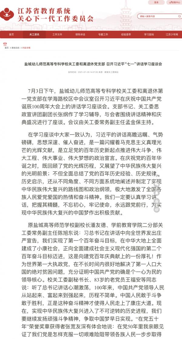教育关工委网站:盐城幼儿师范高等专科学校关工委和离退休党支部 召开习近平“七一”讲话学习座谈会